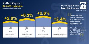 The latest Plumbing & Heating Merchant Index (PHMI) report, published in December, shows Q3 2025 total value sales through specialist Plumbing & Heating merchants were up +2.8% compared to Q3 2024. Volumes sales were down -2.5% while prices increased +5.4%. There was no difference in trading days.