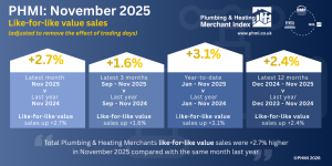The latest figures from the Plumbing & Heating Merchant Index (PHMI) report show total like-for-like value sales for November 2025 through specialist plumbing and heating merchants were up +2.7% compared to the same month the year before. With one less trading day in November 2025, unadjusted value sales were down -2.2%. Unadjusted volume sales fell -6.5% and prices went up +4.6%.