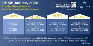 The latest figures from the Plumbing & Heating Merchant Index (PHMI) report show total like-for-like value sales (adjusted to remove the impact of trading days) for January 2026 through specialist plumbing and heating merchants were up +3.0% compared to the same month the year before. Like-for-like volume sales were down -2.8%, however prices rose +6.0%.